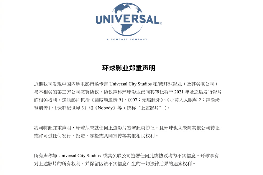 12月21日,环球影业就近日一则不实传言发表郑重声明,声明表示:Universal City Studios和/或环球影业(及其关联公司)从未与不相关第三方公司就转让2021年及之后发行影片的相关权利签署协议。