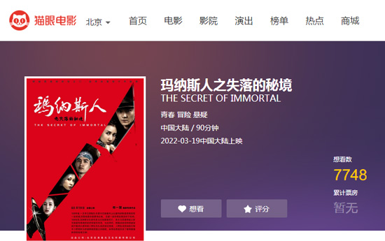 2022年3月19日,西部探险电影《玛纳斯人之失落的秘境》全国上映。